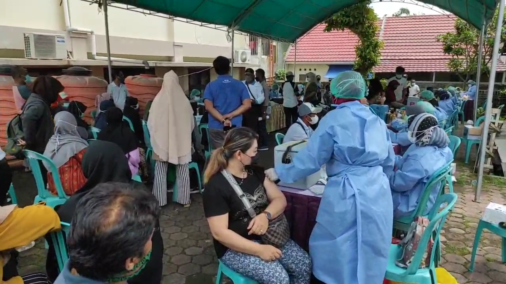 Capaian vaksinasi dosis satu 87,91 persen ini merupakan total keseluruhan atau gabungan antara vaksinasi program dan vaksinasi gotong royong yang dilakukan oleh perusahaan.