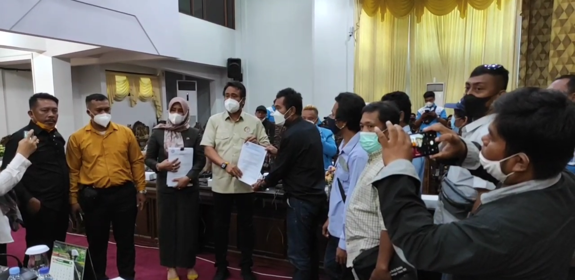 BALIKPAPAN – Puluhan Aliansi Buruh Balikpapan audiensi dengan Dewan Perwakilan Rakyat Daerah (DPRD) Kota Balikpapan, pada Rabu (1/12/2021) siang. Perwakilan para buruh ini diterima langsung oleh Wakil Ketua DPRD Balikpapan Sabaruddin Panrecalle serta didampingi anggota Komisi IV DPRD Balikpapan dan jajaran Disnaker Balikpapan di ruang rapat paripurna DPRD Balikpapan. Walaupun Rapat Dengar Pendapat (RDP) tetap mematuhi protokol kesehatan (Prokes) Covid-19.