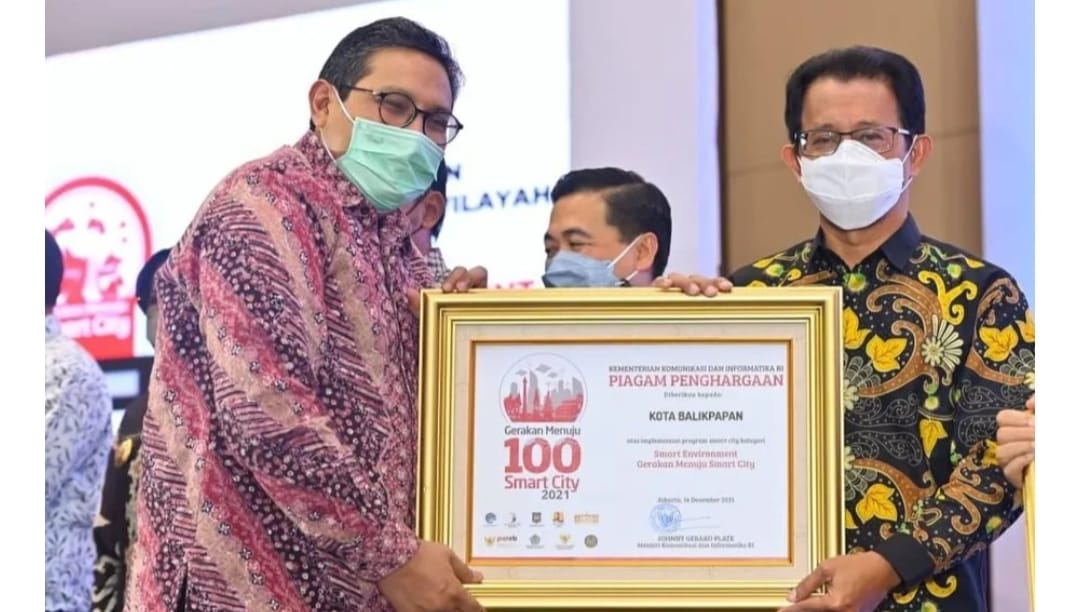 Kepala Dinas Komunikasi dan Informatika (Diskominfo) Kota Balikpapan, Sutadi mewaliki Wali Kota Balikpapan menerima langsung penghargaan yang diterima Kota dari Menteri Komunikasi dan Informatika RI, Johnny G. Plate, di Indonesia Convention Exhibition (ICE) BSD, Jakarta, Kamis (14/12/2021).