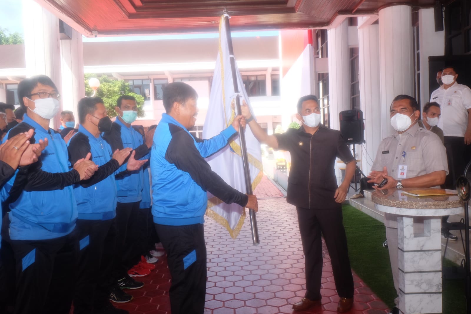 Wali Kota Balikpapan Rahmad Mas’ud didampingi Pj Sekda Kota Balikpapan Muhaimin melepas langsung atlet yang akan mengikuti Porprov Korpri tahun 2022 yang dilaksanakan di Kutai Kertanegara (Kukar)