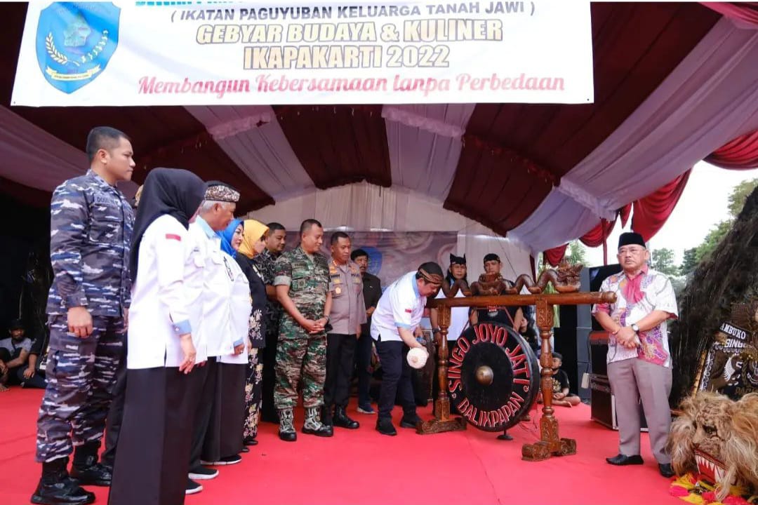 CNBTV.CO.ID – BALIKPAPAN – Dengan adanya pemukulan gong, Ketua Dewan Pimpinan Daerah (DPD) Ikatan Paguyuban Keluarga Tanah Jawi (Ikapakarti) Kota Balikpapan Abdulloh, kegiatab Gebyar Budaya dan Kuliner, di Halaman Parkir Balikpapan Sport Convention Center (BSCC)DOME, Sabtu (3/12/2022) resmi dibuka.