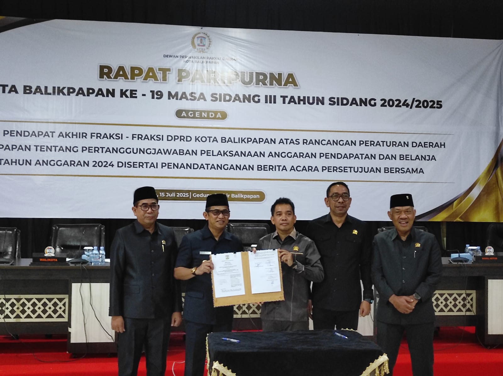 Rapat dipimpin langsung oleh Ketua DPRD Kota Balikpapan, Alwi Al Qadri, didampingi Wakil Ketua DPRD Yono Suherman, Muhammad Taqwa, dan Budiono. Hadir pula Wali Kota Balikpapan, H. Rahmad Mas’ud, SE, serta unsur Forum Koordinasi Pimpinan Daerah (Forkopimda) dan undangan lainnya.